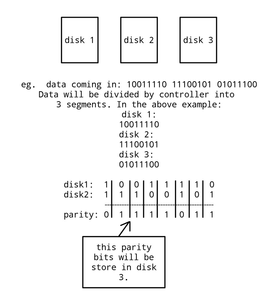 - Parity bit (bit comparison) between any 2 disks is stored in the 3rd disk hence every disk hold parity information of another 2 disks. Aka distributed parity.