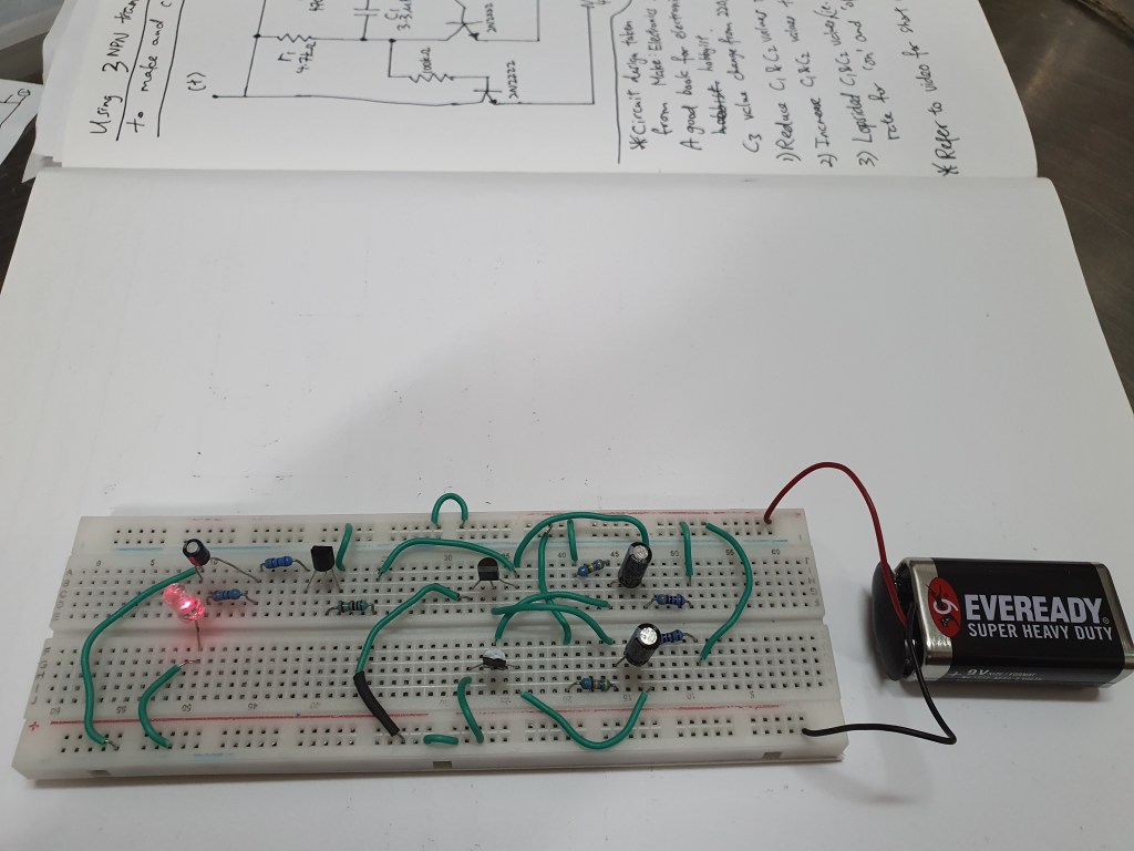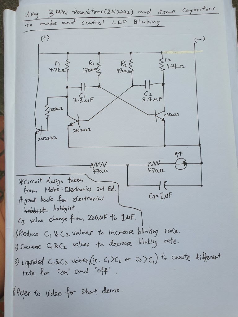 - The original value of C3 is 220uF. I change it to 1uF. Circuit design taken from ‘Make: Electronics 2nd edition’. A fantastic book for electronics hobbyist.