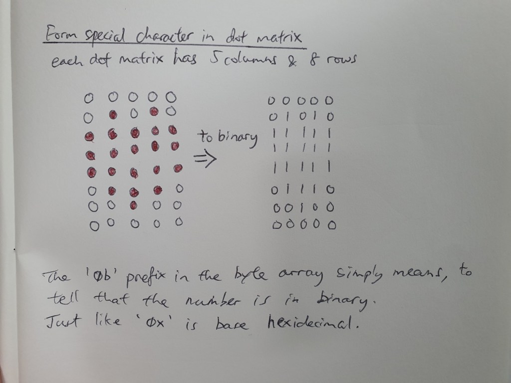 - Pin 3 -V0 : Connected to 10K pot to controlling display contrast for dot matrix(16 dot matrices across x 2 dot matrices topdown). Each dot matrix has 5 columm x 8 row matrix.