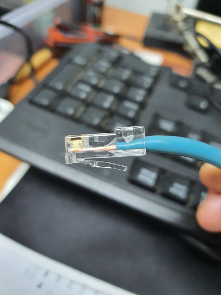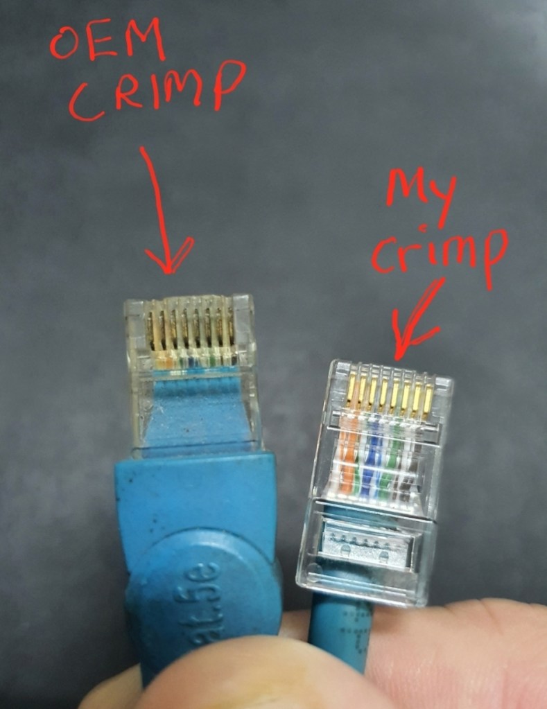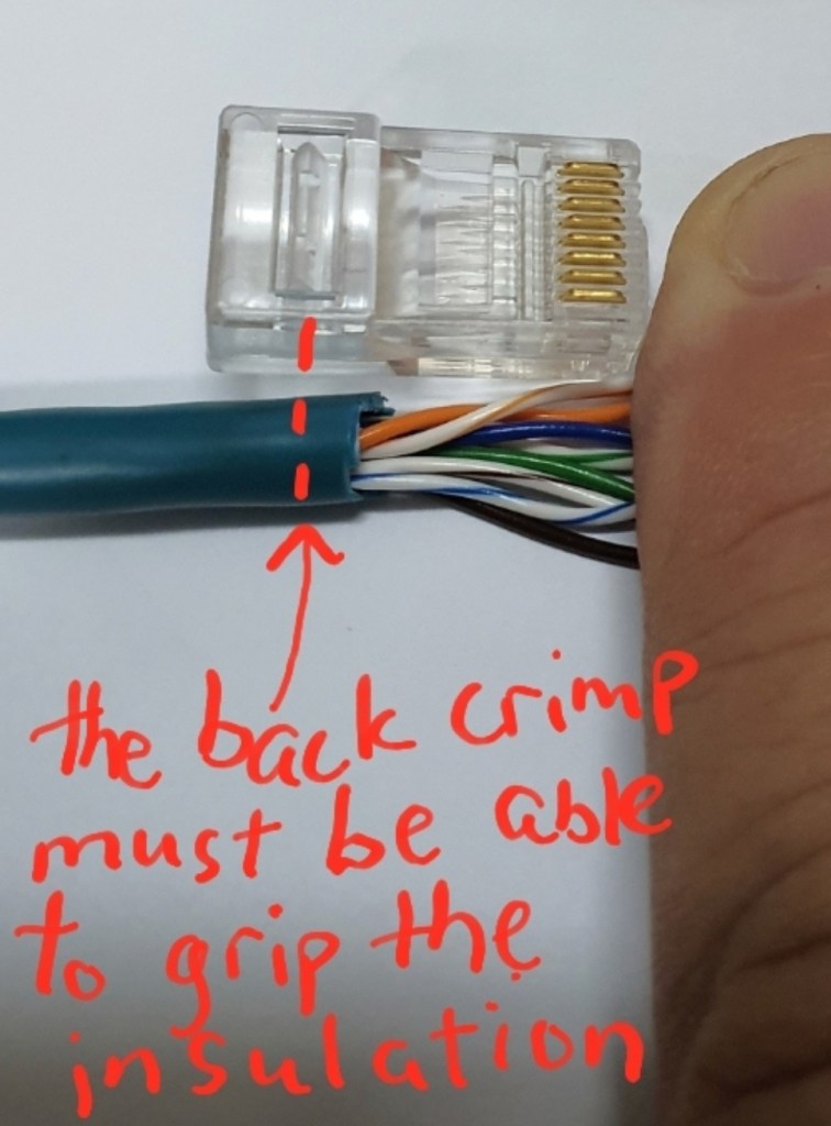 Roughly gauge how long is the crimp length by comparing with the RJ45 connector. The RJ45 back crimper must crimp on the insulation of the cable.
