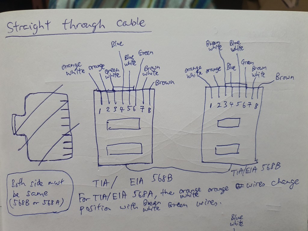 - Straight throught cable aka patch cable- For connecting different devices such as computer to switch, switch to modem.