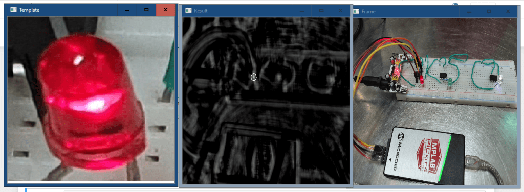 Template Matching is a technique for locating a template image in a larger image. In this example the template image is a red LED. And the larger image (which I call it a frame) in the picture of a circuit on a breadboard.