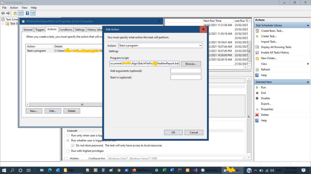 This full automation requires 3 applications (Task scheduler, Excel and python.exe), a Python script and a batch file. This is a full total automation, which means you just need to power on your computer. My earlier post on Running a Python script using a batch file is semi-automation. But of course we can make it more automated by adding a loop and a timer inside the Python script, but I prefer using the task scheduler as you can run concurrent task fully automated.