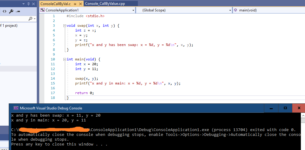 In C, there is a concept call ‘Call By Value’, and the best way to explain is to use a code example: