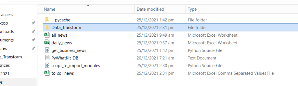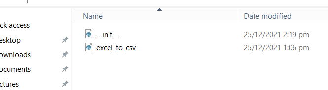 For this example I shall put the excel_to_csv.py file into another folder named ‘Data_Transform’. You need to have a empty python file named __init__.py inside the Data_Transform folder, to tell Python that this folder is a python package. After which you can call the modules using this convention : from Data_Transform.excel_to_csv import excel_to_csv.